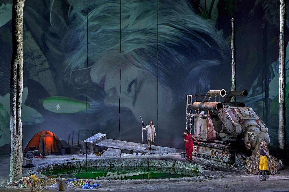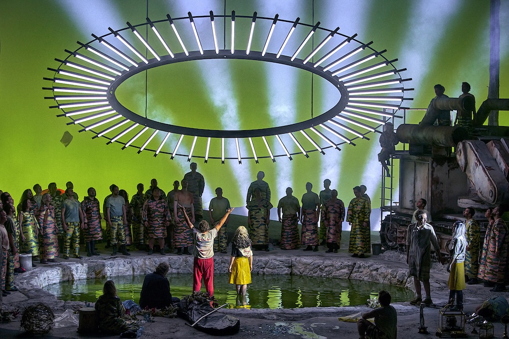 Aunque supongo que resulte tremendamente halagador que te llamen para una producción en Bayreuth, también te plantean un problema: ¿qué cuento yo que no se haya dicho ya de esta obra? Jay Scheub nos presenta una propuesta escénica distópica -estrenada en 2023-, de una ciencia ficción no demasiado brillante y usando una escenografía muy tópica (proyecciones, estanques de agua, flores enormes, círculo de luces también grande que se puede pensar que simula religiosidad, tanques abandonados, guiños a 2001, Una odisea en el espacio…) y un vestuario también de ficción de serie b. Realmente es una puesta que no molesta, que lleva su propia dinámica que interesa muy poco al verla, pero que respeta, eso sí, paso por paso el libreto de Parsifal (excepto el final donde Parsifal y Kundry se quedan juntos, algo que también ya se ha visto) y eso, hoy, casi se agradece.